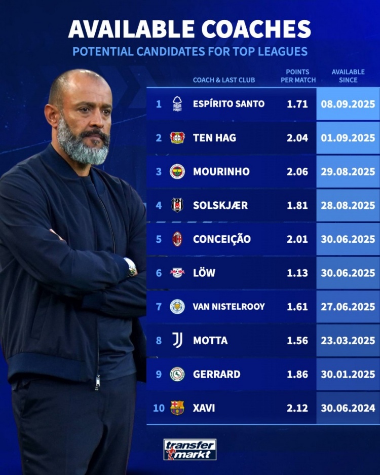 德转盘点目前赋闲教练:穆里尼奥、滕哈赫、莫塔、哈维、努诺在列